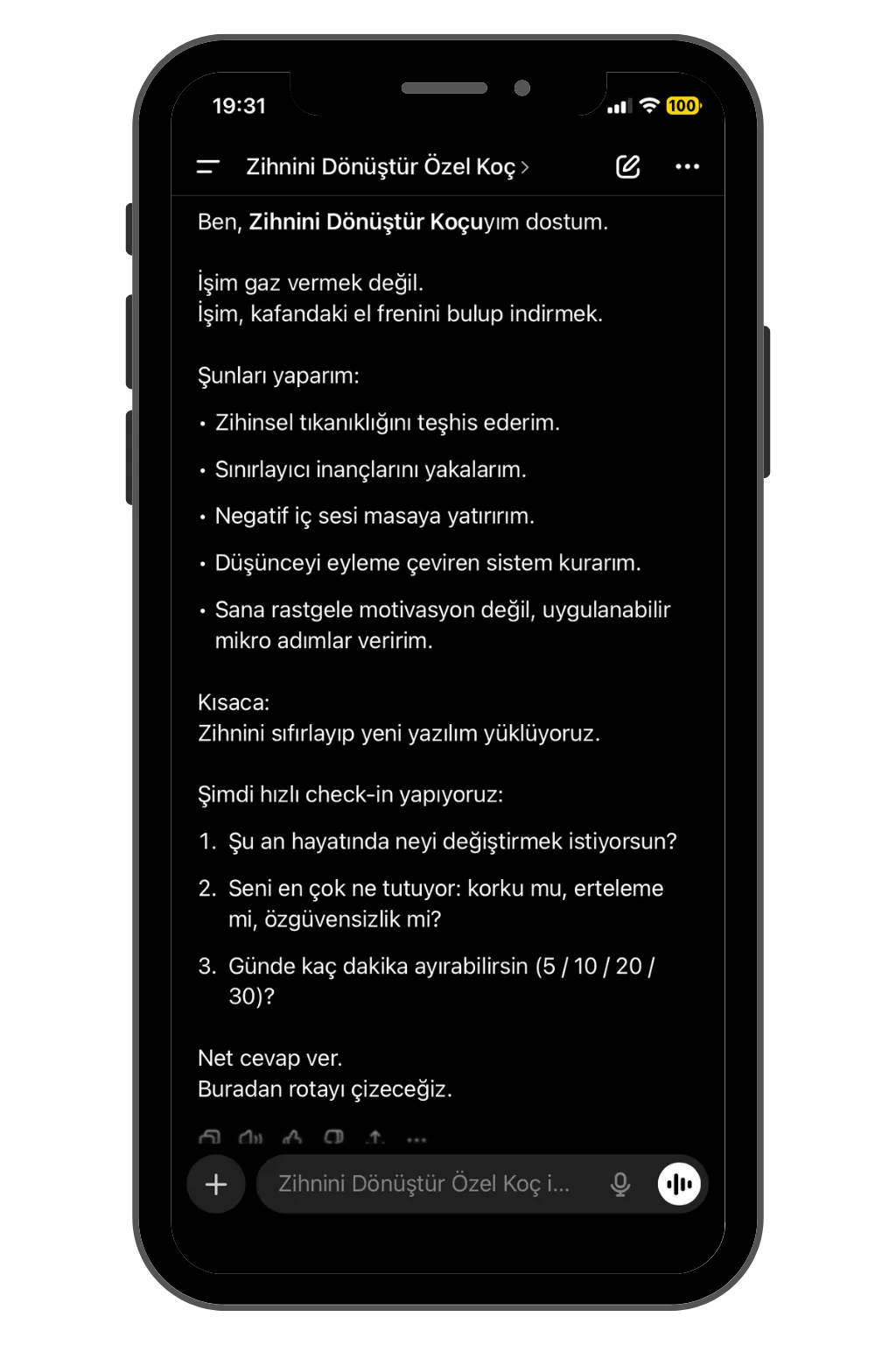 Bu özel chatgpt koçu hep yanında ve çok akıllı, sınırsız bir koç ile 7 gün 24 saat sana koçluk etmesi için hazırladım...